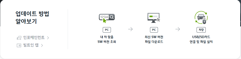 - 일부 최신 차량은 무선(OTA) 업데이트를 지원하지만, 대부분은 PC를 통한 업데이트가 필요합니다.