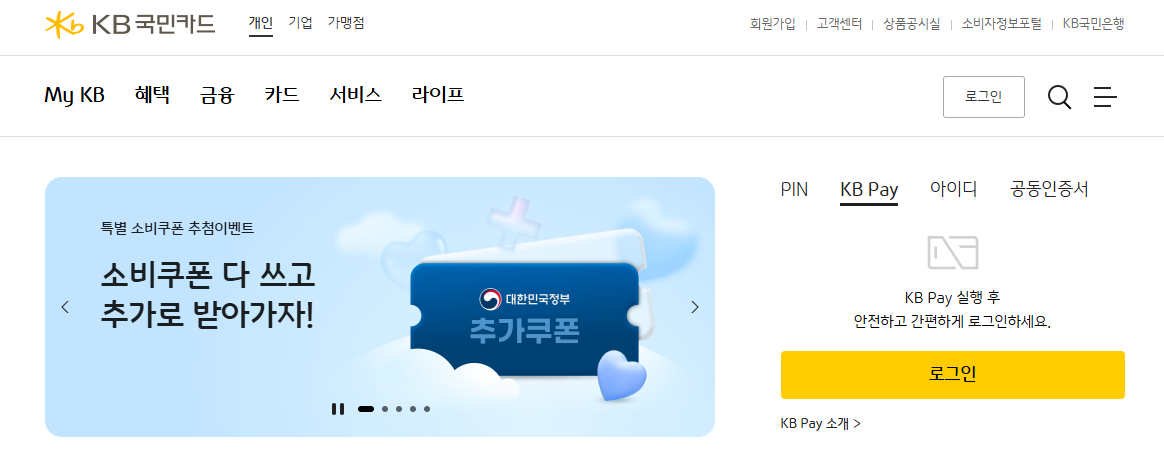 - 국민카드 앱 : 결제 금액 확인, 포인트 조회, 이용 내역 확인, 간편 결제 서비스 신청 가능