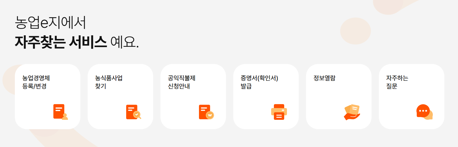 농업e지 홈페이지는 매우 다양한 기능과 메뉴를 갖추고 있어서 누구나 목적에 맞게 활용할 수 있습니다. 대표적인 서비스들을 아래에 정리해드릴게요.